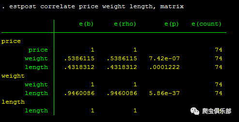理论上e( )中储存的估计结果都可以使用esttab命令输出的,但需要一个命令将储存在e( )中的结果传输到esttab里面,这就是estpost命令,以常见的变量相关系数表的导出为例: