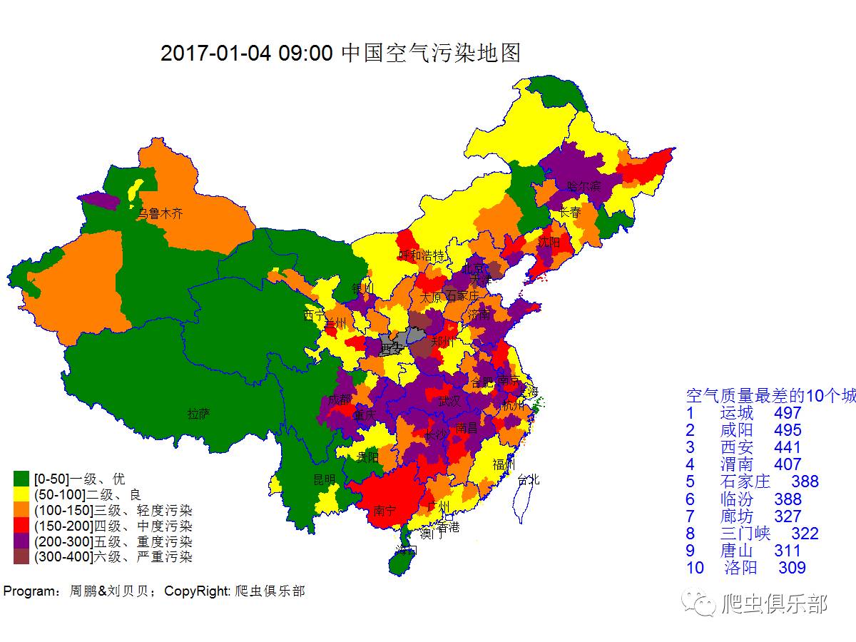 不过,小编只教你爬取文字形式的空气质量哪里过瘾?看着爬虫酱每日推出的空气质量地图,早已有读者在后台留言要求出一期地图绘制的推文。诸位看官别着急呀,你想要的小编通通满足你,这不,地图绘制的推文噔噔噔噔闪亮登场,学完别忘了给小编赏个鸡腿呀~