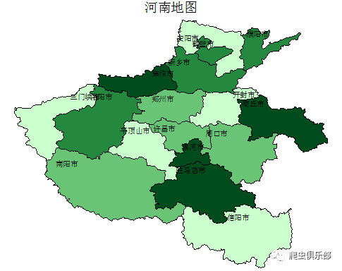 spmap y using `"hn_citymapcoord"',id(id) title ("河南地图") label(label(NAME99) xcoord(CENTROID_X) ycoord(CENTROID_Y) ) fcolor(Greens2) legenda(off)