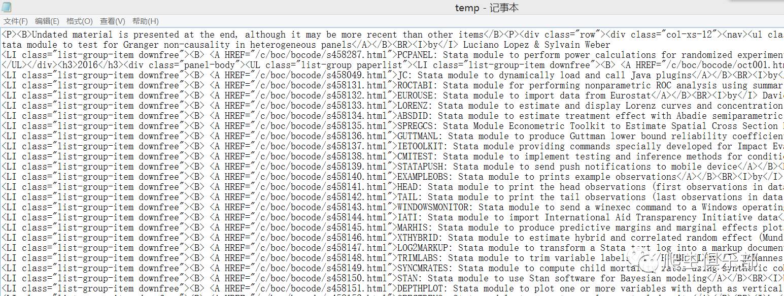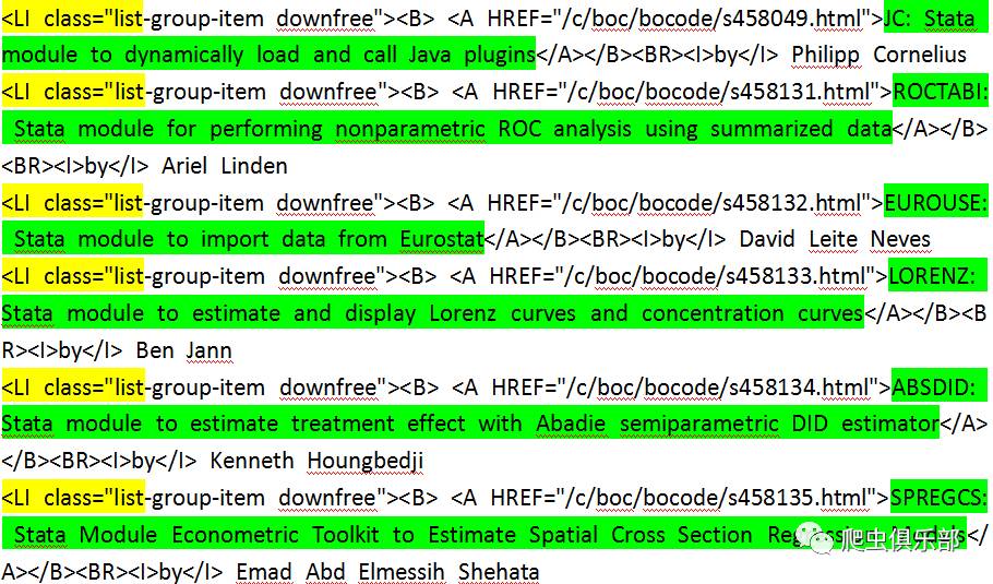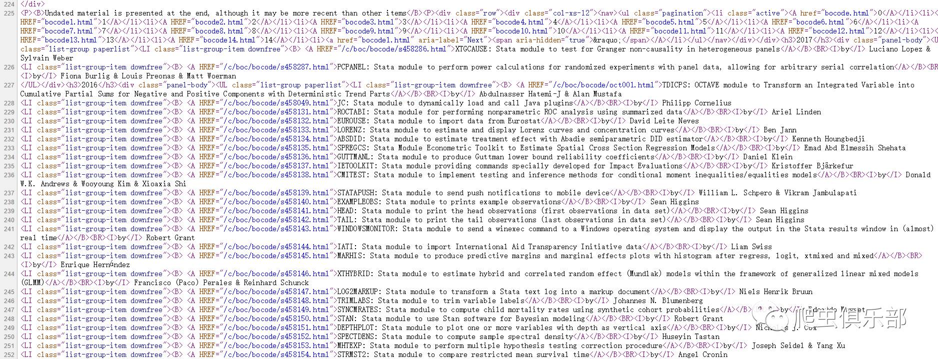 因为从225行开始,才是我们需要的内容,因此我们只需保留该部分即可。subinfile可以帮我们保留文本文档中含有某个字符串的行。通过分析(如上图所示),我们把定位内容用黄色阴影high light起来,对应“<LI class="list”。绿色阴影是我们所需要获取的内容,如:JC: Stata module to dynamically load and call Java plugins。