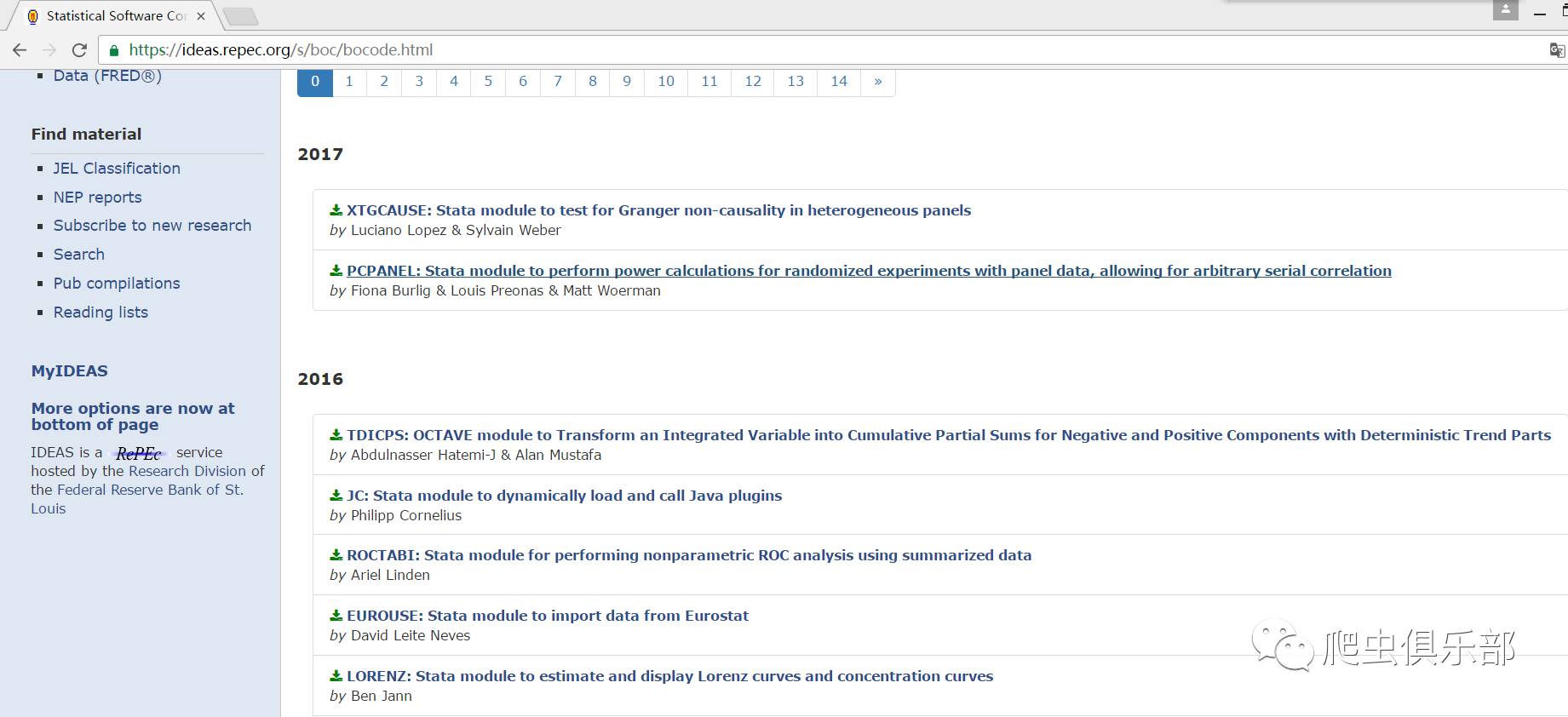 可以看到,ssc中的命令包含在15个网页中,对应上图0-14。相应网页为:https://ideas.repec.org/s/boc/bocode.html;