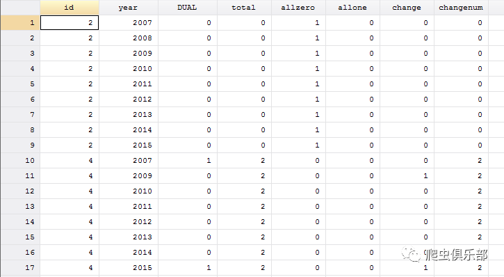 需要注意的是,由于每个id的第一个DUAL[_n - 1]值是缺失值,不等于DUAL[1],但也不表示进行了变换,所以我们要让其change = 0。