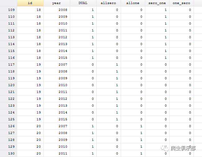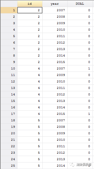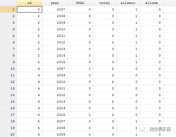 对于DUAL一直为0或1的样本,我们可以对每个id的DUAL求和,和为0则表明DUAL一直为0,和等于每个id的观测值个数则表明DUAL一直为1。
