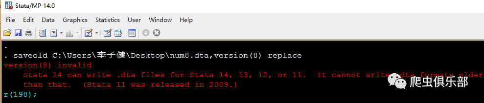 该命令仅仅能够将数据保存为stata11/stata12/stata13版本可以打开的数据,当我们希望其保存为stata11版本之前可以使用的数据时,会显示错误。