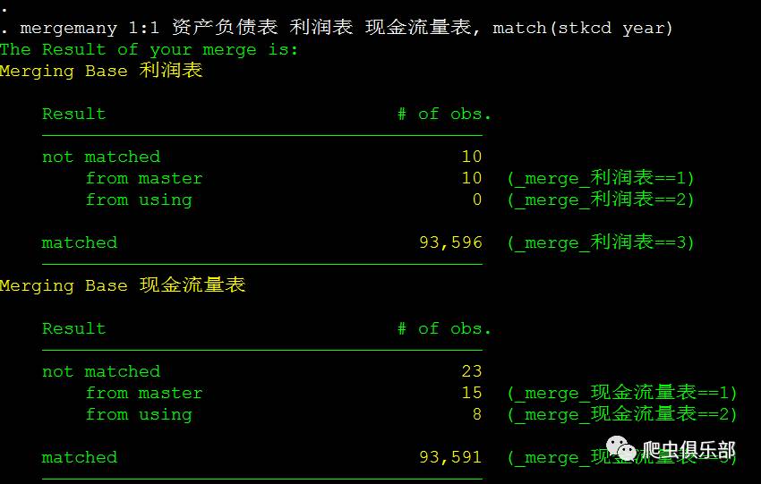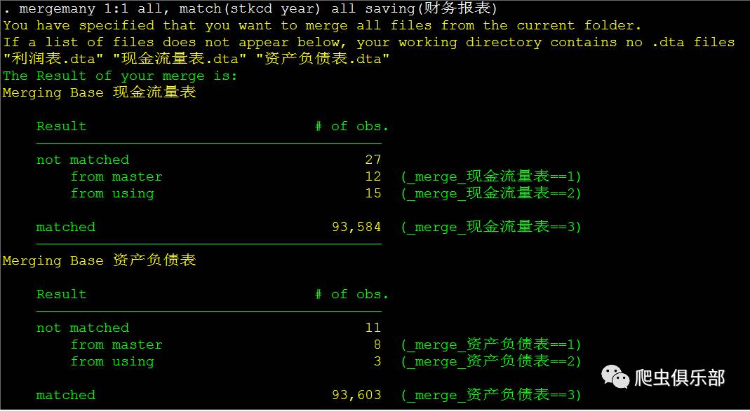 mergemany 1:1 all, match(stkcd year) all saving(财务报表)