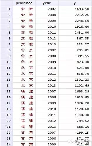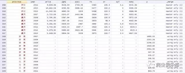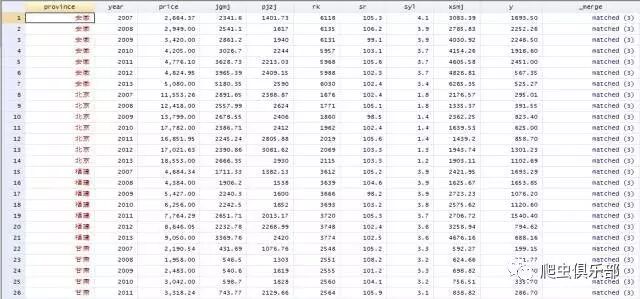接 下来,问题来了,如何去除变量province的字符之间及字符两端的空格呢?也许有人会觉得就这样放着也没有什么大碍。如果可以不处理,自然可以这么放 着。但是我们在做实证研究时,岂会只用这么几个变量?自然是需要与其他数据进行合并。比如,笔者需要把这个土地数据与之前处理好的那些数据进行合并。之前 的数据形式如下所示: