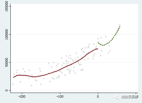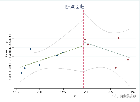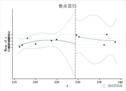 cmogram y x if x > $b-20 & x <$b+20, title(断点回归) cut($b) scatter lineat($b)  lfitci histopts(bin(15))