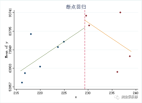 cmogram y x if x > $b-20 & x <$b+20, title(断点回归) cut($b) scatter lineat($b) lfit histopts(bin(15))