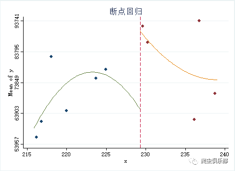 cmogram y x if x > $b-20 & x <$b+20, title(断点回归) cut($b) scatter lineat($b) qfitci histopts(bin(15))