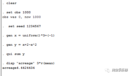 disp "acreage" 3*r(mean) //求平均值时,在定积分中乘了x的密度函数,此时要还原为最初的定积分