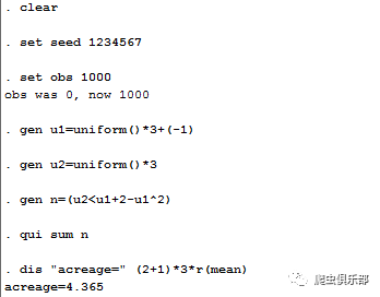 gen n=(u2<u1+2-u1^2) //生成虚拟变量n,若随机点数落入积分区域内为1.否则为0
