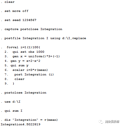 定积分是 函数的一种特定结构总合式的极限,这种极限不仅是计算区域面积或度量几何体的数学工具,而且也是计算许多实际问题的重要工具。我们可以应用定积分来计算一 些常见的几何量、物理量以及经济参数。当计算某个定积分时,若我们能够得到f(x)的原函数,我们就可以利用牛顿-莱布尼茨公式计算定积分的值。然而,在 很多情况下,由于f(x)的形式太复杂,我们很难推导原函数,此时我们求助于数值积分,即:曲线和坐标轴围成曲边形的面积。今天分享的内容是在stata中如何用随机模拟法计算数值积分,下面我们通过具体的实例给大家展示。