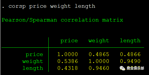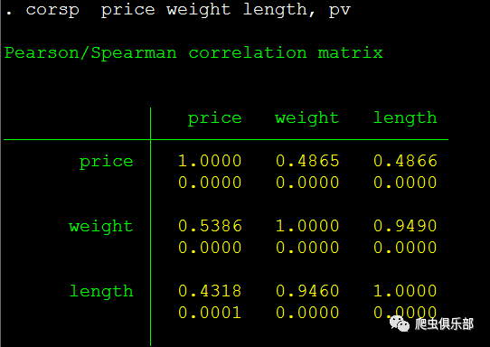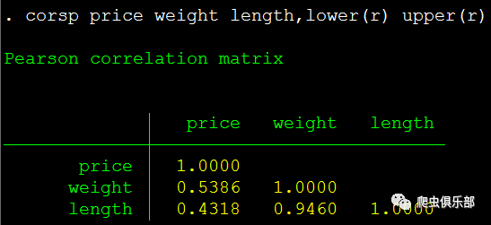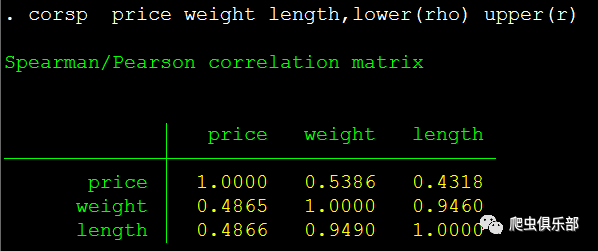 图输出矩阵就是选择price、weight、length三个变量进行相关分析的结果,相关系数结果保留小数点后四位。其中,lower(rho)和
