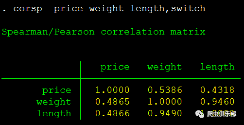 如果不使用lower和upper选项,在corsp命令的默认输出矩阵中,对角线右上方是斯皮尔曼相关系数,对角线左下方是皮尔森相关系数。你也可以使用switch选项调换两种相关系数的排列位置。