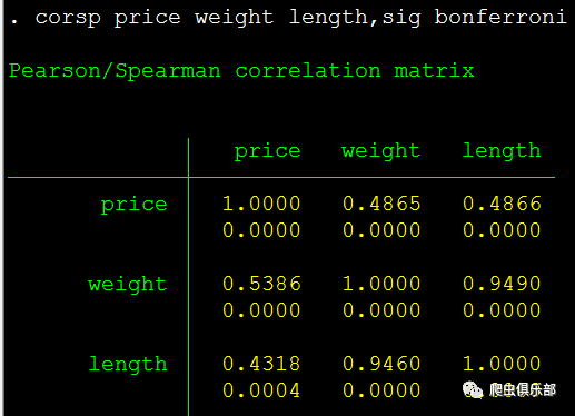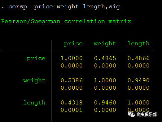 以上就是corsp命令及全部选项的使用方法,如果你想把相关系数结果保存在word中,并且添加表示显著性的*号,请关注爬虫俱乐部的后续推文。