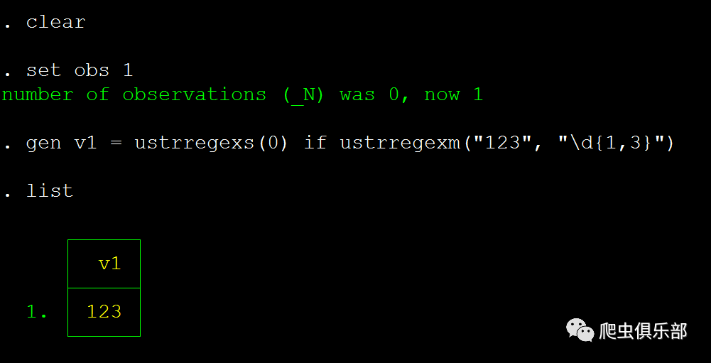 gen v1 = ustrregexs(0) if ustrregexm("123", "\d{1,3}")