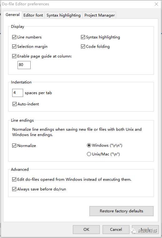 那 么还有什么办法能够更好解决这个问题吗?熟悉Python的朋友都知道,在我们使用IDLE来编辑Python程序时,每次运行都会提示我们先保存才能运 行,那么Stata中有没有什么能够让我们在每次运行程序时都把do-file保存呢?在Stata14的do-file editor里面,我们选着edit——preferences,在do-file editor preferences的窗口中的Advance框内有一个选项Always save before do/run,可以让我们在每次运行do-file时自动保存。