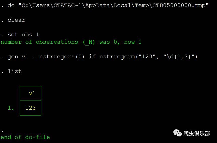 一般来说我们写程序 都是边写便运行,当然不排除你可以看一遍原始数据,然后凭借你强大到足以参加最强大脑的工作记忆能力在脑海中完整地形成了一套程序,然后默写到do- file中,如果你有这样的能力,当然也就不需要这样的方法了。我们每一次运行do-file,都会生成一个临时文件。例如我们之前运行正常的do- file,生成的临时文件所在的路径和文件的名称都可以在输出结果中看到。