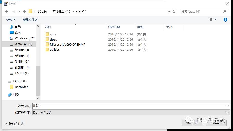 在这个选项前勾上对勾,然后我们把刚才的程序拿来再运行,如果这个do-file没有保存过,那么会弹出一个窗口让我们保存这个do-file,例如我们保存在D盘stata14文件夹下面,命名为崩溃.do。