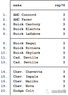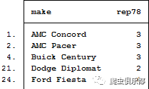 生成了新的变量x后,一条list命令就可以找出制定维修次数的车辆品牌车型: