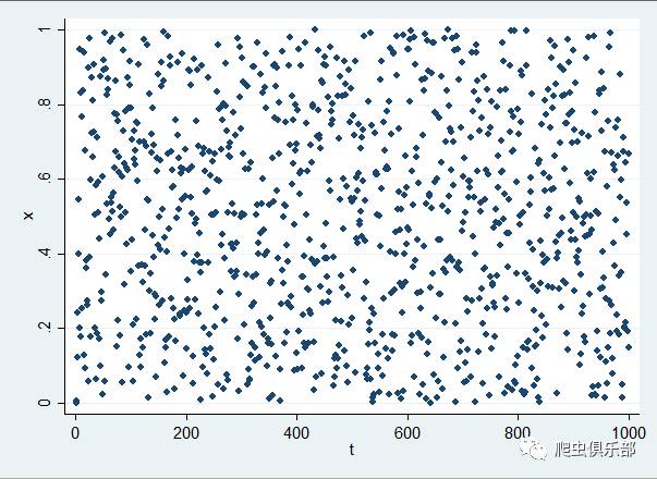 根据图1,可以看到,生成(0-1)之间的1000个伪随机数中,最小值几乎为0,最大值约为0.9997,几乎为1,均值约为0.49,接近0.5,标准差约0.28。下面再来看图2,可以很直观地看到,这些点“随机”地分布在关于x、t的散点图上面。