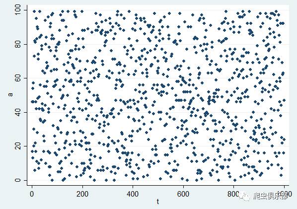 在图5中,生成了[0,100)上的1000个伪随机整数,最小值为0,最大值为99,均值约49.95,接近50,标准差约28.59。下面图6中,可以直观地看到,伪随机数a随着t的变化,“随机”地分布在关于x、t的散点图上面。