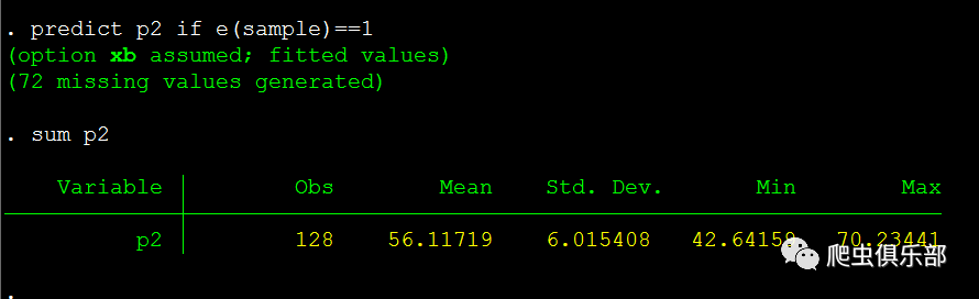 我们发现p2的观测值数是128,p1的是200,if e(sample)==1 的作用是针对我们刚刚在*模型估计中用到的那些样本。