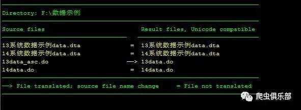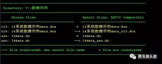 左侧为源文件,右侧为结果文件,比较两列可以发现结果文件与源文件有着相同的名称,其中三个是相同的文件,但是有一个文件从ASCII转换为Unicode码,这一个文件的源文件名称通过包含后缀而改变。对于do-files和其他文本文件,默认后缀为_asc。