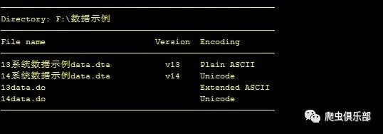 在这里我们就可以看到在两个dta文件和两个do文件中,有一个文件包含纯ASCII编码字符,一个文件包含扩展ASCII编码字符,两个文件包含Unicode编码字符。