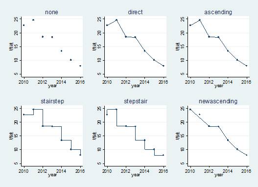 其中前四种在stata命令中可以由简单的字母替代,分别是i、l、L和J,也就是说,当你想使用connect(direct)直线连接各个点时,你可以把里面的direct替换成l,两者效果一样。
