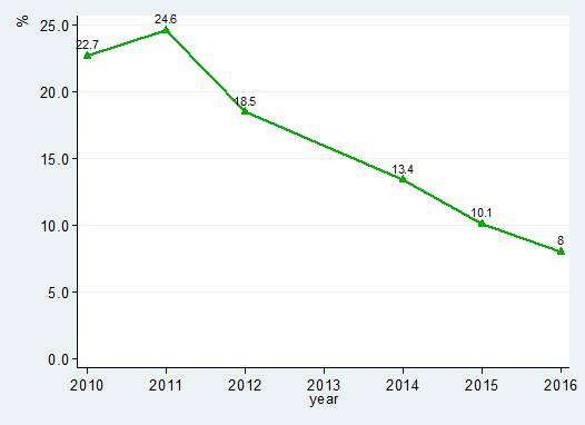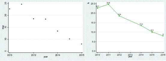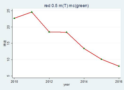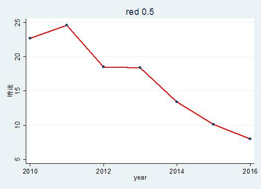 mlabel(" 增速") mlabposition(12) mlabcolor(black) xlabel(2010(1)2016) ylabel(0(5)25,angle(horizontal) format(%9.1f)) ytitle(%,placement(north))