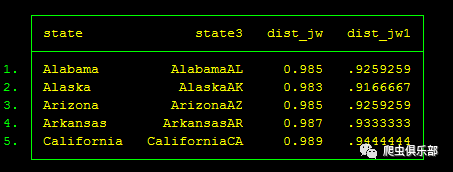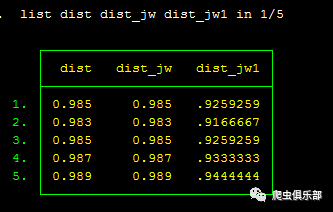 在计算出Jaro距离后,由于变量state和state3的观测值前缀的相同的长度超过4,所以按4计算,我们在命令中给p赋值为0.2,所以Jaro-Winkler距离等于Jaro距离加上0.8倍的1减Jaro距离。