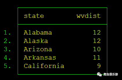 比如,state的第5个观测值“California”要转换成“westvirginia”,先插入w、e、s三个字母,再将C、a、l三个字母分别替换为t、空格和v,字母i匹配成功不做编辑,再将f、o、r分别替换为r、g、i。总共进行了9次编辑操作,所以算得编辑距离为9。