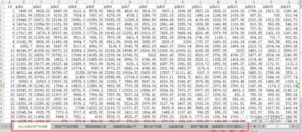 我 们现在有一份Excel文件,文件中是31个省份16年的全社会固定资产投资额、房地产开发投资额、商品房销售价格、城镇居民消费水平、国内生产总值、金 融增加值、房地产增加值、城镇居民人均可支配收入的数据(共8个变量),这8个变量16年的数据分别在该Excel表的不同sheet中,每一个 sheet中的数据都是宽型的,如下图所示: