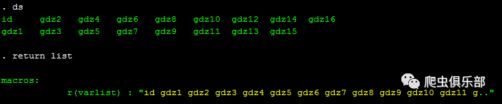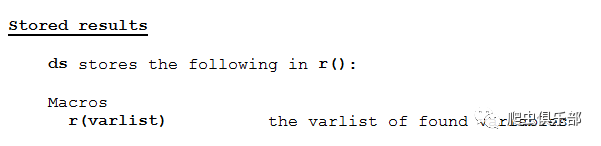 ds命令是用来列示变量的名称或者其他特征的,同时ds命令会产生一个返回值r(varlist),r(varlist)将所有的变量名储存为一个字符串以空格隔开。