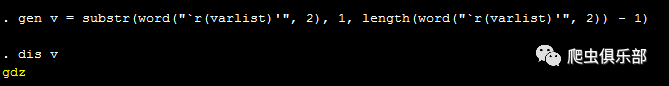 那么从这个字符串中提取出“gdz”就要用到处理字符型变量的函数,如substr( )函数、word( )函数、和length( )函数,对字符串函数不熟悉的朋友,可查看往期推文,或help文件。