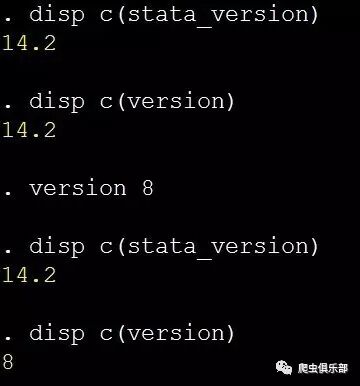 这里需要指出的是,当前用户可能在使用Stata 14.0,但是随着Stata软件的更新,一些老的命令可能被废止,但是如果找到了一个较早时期的程序,里面用到了某些被废止的程序呢?这时候用户其实是可以设定Stata的命令编译版本的,比如用命令version 8.0就告诉Stata,以后遇到命令,都按照Stata 8.0的系统进行编译,即假定用户使用的是Stata 8.0版本。Stata的当前版本号和命令编译版本号可以通过两个c()类返回值获取,分别是c(stata_version)与c(version)。下面的命令给出了相应的用法,在两个disp之间,我们用version 8.0设定了命令编译版本,所以,c(version)给出的结果就从缺省状态的14.2变为8.0了。