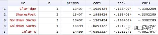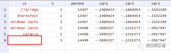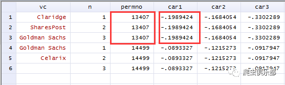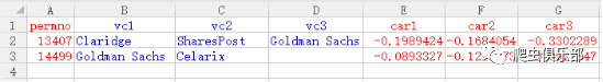 肖教授的原始数据结构是这样的:数据主要包括三部分内容,permno是独特的公司代码(类似于中国的股票代码);vc1-vc3是该公司上市前投资于该公司的风投列表;car1-car3是不同时间窗口内的累积收益率。如下图所示。