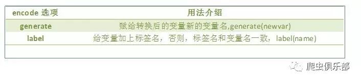 encode命令:只可以将以字符型格式储存的非数值变量转换为数值型变量,它的返回值只是1,2,3……的序号变量,相同属性的观测值赋值相同,相当于给字符变量重新编码,并且将原来的字符型数据设置为转换后的数值型变量的标签。常用选项介绍如下: