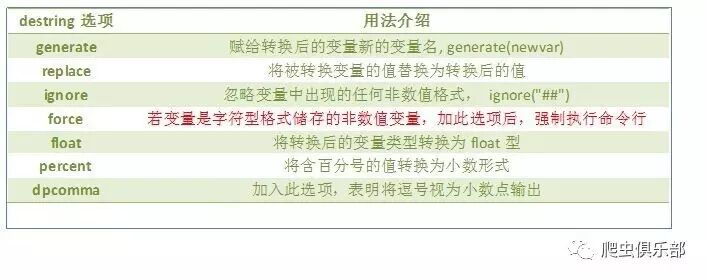 destring命令:将以字符型格式储存的数值变量转化为数值型变量。常用选项介绍如下: