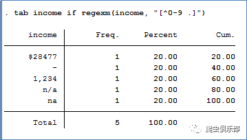 tab income if regexm(income, "[^0-9\.]")