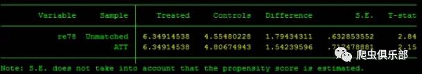 黄色数据部分中,作为对比,第一行为未配对数据的结果,第二行为我们需要的处理效应,即配对以后的结果,我们发现,在控制了其他因素的影响以后,接受培训的员工在1978年的工资水平在5%的水平上显著大于为接受培训的员工(即我们需要注意的是第二行中的Difference的显著性),我们得到培训能够增加员工工资水平的结论。