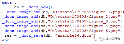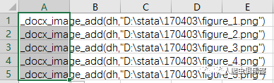 新建文档后,接下来就是添加图片,使用_docx_image_add( , )函数,括号内,逗号前是返回dh值,逗号后是图片的路径与文件名。也许你会问,我有很多图片要添加的时候,能不能用forvalues一次性解决啊?很遗憾,没有~不过,只要你想办法,就不用一行一行地输入了。虽然STATA帮不了你,但是你还有excel啊啊啊啊。