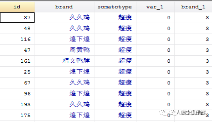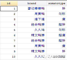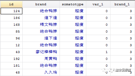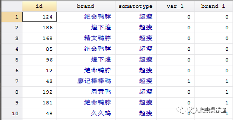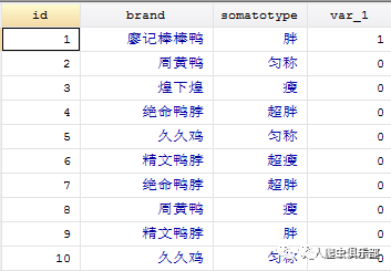 第三步,我们只保留somatotype和brand_1两个变量,删去重复的obs,得到的便是喜欢廖记棒棒鸭的人数。