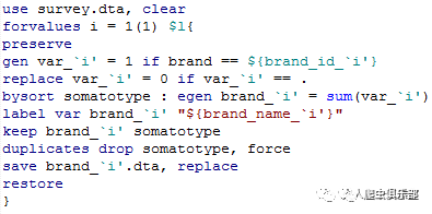 以上的代码展示了全局暂元的两种引用方法:forvalues函数内的引用和函数外的引用。先说函数外的引用方法:在变量名前添加美元符号“$”,如上面的“$l”,如果该全局暂元储存的值是字符型,还需要添加双引号“”””,如“”$l””。至于函数内的引用方法:先用大括号“{}”把变量名包住,再在前面添加美元符号“$”,如上面的${brand_id_`i'},当i=3时,引用的是brand_id_3的值——333,语句gen var_`i' = 1 if brand == ${brand_id_`i'}实际执行的是gen var_3 = 1 if brand == 33,即建立变量var_3,并且品牌为周黄鸭时,令var_3的值为1.如果引用的全局暂元储存的值是字符型,也是添加双引号“”””即可,如上面给变量添加标签时的引用"${brand_name_`i'}"。