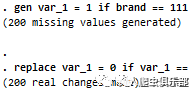 在第二个图中,brand_1[1] = var[1],brand_1[2] = var[2] + brand_1[1],brand_1[3] = var[3] + brand_1[2],以此类推。鉴于var[1]到var[6]都是0,var[7]是1,直到第7个obs时brand_1的值才是1,而var[8]到var[10]又全是0,brand_1[8]到brand_1[10]的值全是1.而在第一个图中,brand_1直接给出一个总数。显然,只用egen才达到我们的全部加总的目的。