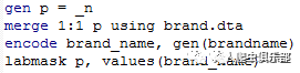 P的值的标签来自brand数据文件。在这里我们用brand_name的值添加到p的值的标签里的。这样的好处是不用一个一个地添加。这种方法包括两步:先encode要作为标签的变量,然后给目标变量添加标签(labmask).这又是一个重要技巧~