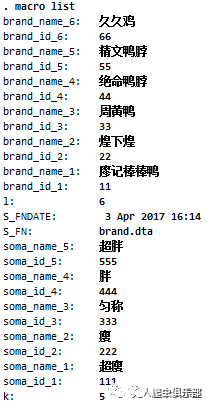 在以上的语句中,我们建立了13个全局暂元:表示数据文件中的obs数量的l,表示品牌代号的brand_id_1,brand_id_2,brand_id_3,brand_id_4,brand_id_5,brand_id_6,分别表示廖记棒棒鸭、煌下煌、周黄鸭、绝命鸭脖、精文鸭脖和久久鸡,还有表示品牌名字brand_name_1,brand_name_2,brand_name_3,brand_name_4,brand_name_5,brand_name_6,分别表示的品牌跟品牌代号一致。由以上可知,全局变量可储存的值的类型既可以是数值型,也可以是字符型。那我能不能直接把包含一系列值的变量直接付给一个全局暂元呢?例如,令global brand_id = brand. 这样貌似行不通,这种情况下我们只把brand的第一个值,亦即111,赋给了brand_id,换句话说,brand_id只储存了一个值,111。全局暂元只能储存单值!