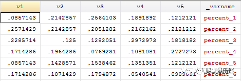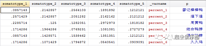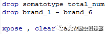 Xpose是STATA自带的转置函数,详情请输入help xpose. 转置以前,我们先删掉一些无关变量, somatotype,total_num,brand_1到brand_6。使用以上语句转置后,原来的5行变成5个变量,表示各体型偏好各品牌的比例的,v1-v5,以及一个新变量_varname,_varname描述了各行对应的转置前的变量名。