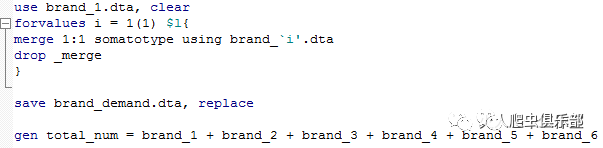 在以上的forvalues函数,我们对每一个品牌生成一个独立的数据文件(“save brand_`i'.dta, replace”),现在,我们合并这些数据文件,加总求和。